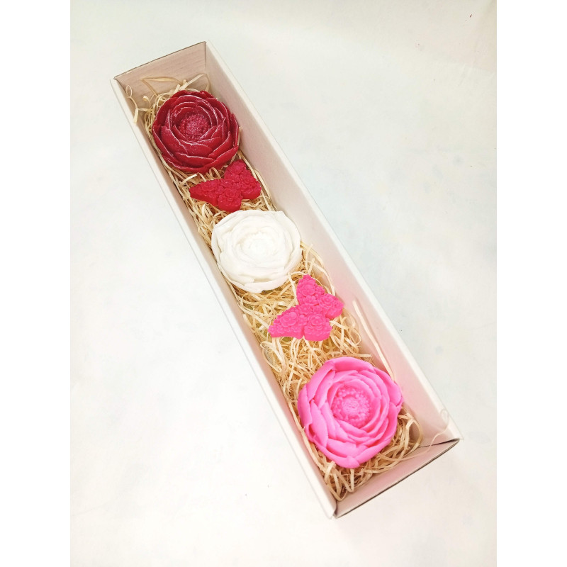 Dlouhá kazeta pivoňka, motýl je romantický voňavý dárek. Ručně vyráběná mýdla nabízíme v různých barvách a vůních s možností dárkové krabičky i vlastních kombinací na přání. Ideální pro Valentýn, narozeniny, výročí nebo jen tak z lásky.
