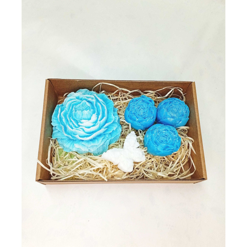 Střední kazeta pivoňka plná, pivoňka poupě, motýlek je romantický voňavý dárek. Ručně vyráběná mýdla nabízíme v různých barvách a vůních s možností dárkové krabičky i vlastních kombinací na přání. Ideální pro Valentýn, narozeniny, výročí nebo jen tak z lásky.