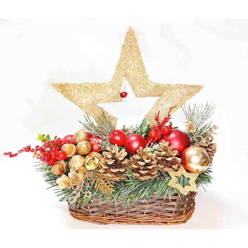 Vánoční kompozice Hvězda je elegantní dekorací kombinující přírodní a slavnostní prvky: zlatá hvězda jako ústřední prvek, šišky, oříšek, větvičky smrku, vánoční koule a další ozdoby. Každý prvek je pečlivě sladěn v harmonii. Kompozice je vhodná jak na hrob, tak do domácnosti – na stůl, parapet, do vstupu nebo jako výraz vánoční nálady venku.