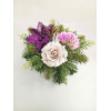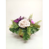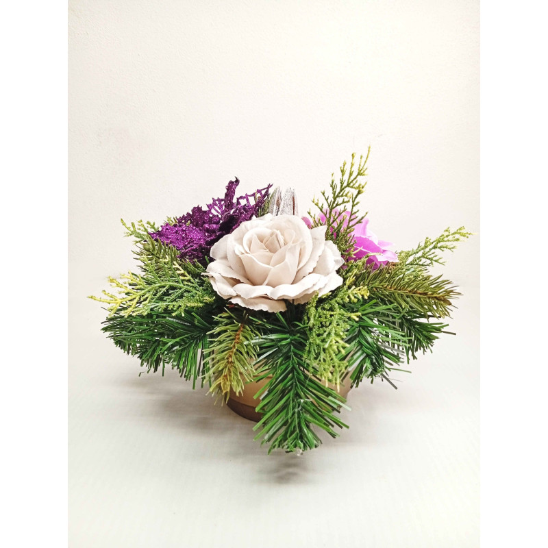 Vánoční kompozice s růží spojuje tradiční vánoční prvky s jemným květinovým nádechem. Hlavními složkami jsou fialová hvězda, béžové a fialové růže, šišky a přírodní větvičky smrku. Tato kompozice je vhodná jak na hrob, tak do domácnosti – na stůl, parapet nebo jako součást vánoční výzdoby. Díky ruční výrobě s důrazem na detail a kvalitní materiály si dekorace zachová svůj vzhled po celou sváteční sezónu. Nabízíme možnost výběru barev a detailů dle vašeho přání, aby kompozice ladila s vaším stylem a prostorem.