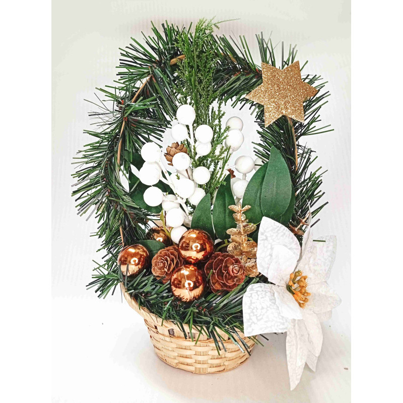 Vánoční košík je ručně vyráběná dekorace, která spojuje přírodní materiály s vánočními prvky, čímž vytváří harmonický a slavnostní vzhled. Základ tvoří přírodní košík, na kterém spočívá umělá smrková chvojí. Dominantními ozdobami jsou vánoční koule, šišky, zlatá hvězda, vánoční hvězda květ a umělé jmelí, které dodávají kompozici elegantní a slavnostní vzhled. Tato dekorace je ideální pro umístění na hrob během zimních měsíců nebo jako ozdoba do domácnosti – na stůl, parapet či jako součást vánoční výzdoby. Díky ruční výrobě s důrazem na detail a kvalitní materiály si kompozice zachová svůj vzhled po celou zimní sezónu. Nabízíme možnost výběru barev a detailů dle vašeho přání, aby kompozice ladila s vaším stylem a prostorem.
