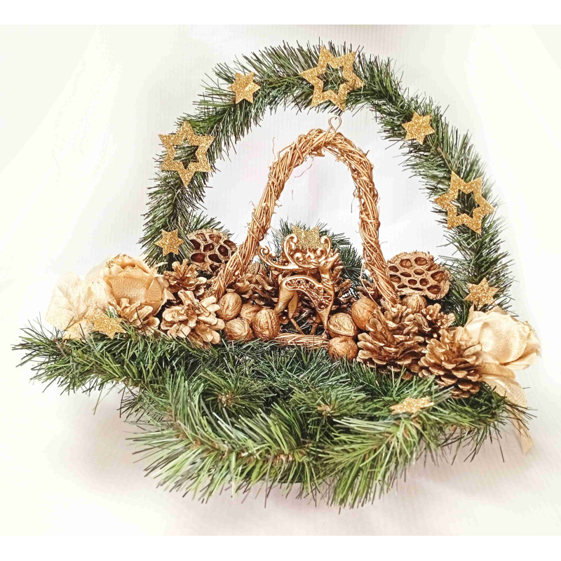 Vánoční kompozice Zlatá je elegantní a slavnostní dekorace, která spojuje přírodní prvky s luxusními zlatými akcenty. Tato ručně vyráběná aranžmá je ideální volbou pro ty, kteří hledají vkusnou výzdobu na hrob či do domácnosti během vánoční sezóny.