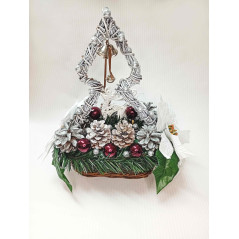 Kompozice se zvonečky je výjimečná vánoční dekorace, která spojuje tradiční motivy s jemným designem a ruční precizností. Základ tvoří proutěný košík vyplněný umělým smrkovým chvojím, které dodává dekoraci stálou zelenou strukturu bez potřeby údržby. Dominantou je ladné zvonění dekorativních zvonečků, které symbolicky evokují vánoční atmosféru. Kompozice je dále obohacena o proutěný stromeček, hvězdu v bílé barvě, šišky, vánoční koule a další efektní ozdoby, sladěné tak, aby výsledkem byla elegantní a slavnostní výzdoba.